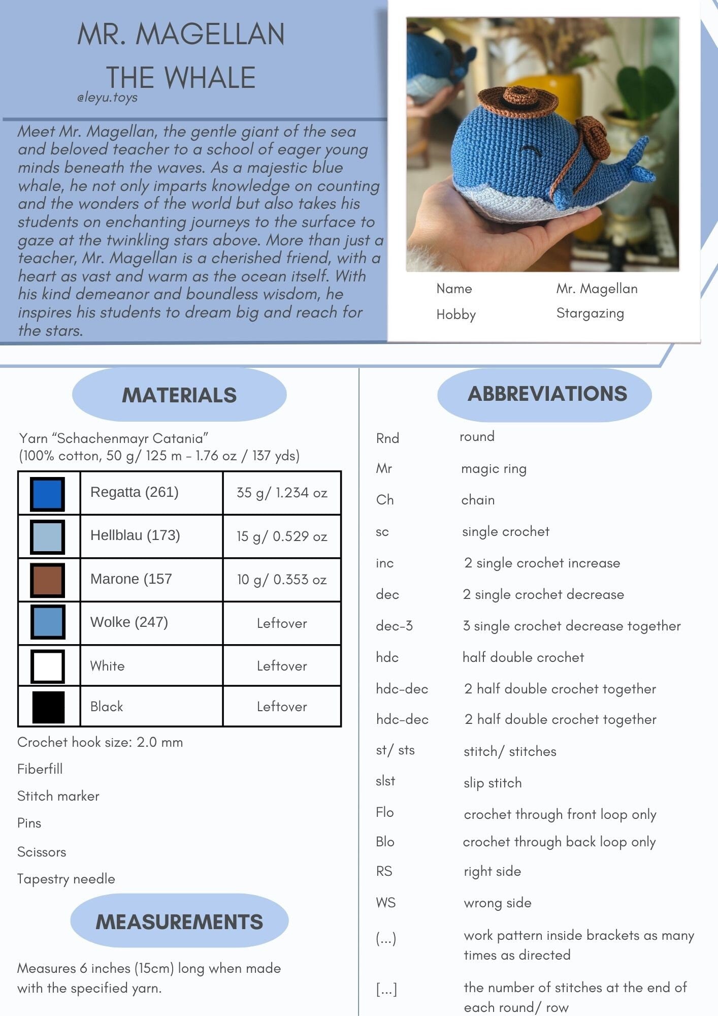 This digital download contains the full crochet pattern for creating Mr. Magellan, a small whale plush with a streamlined shape and clear stitch definition.